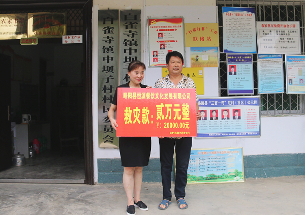 7月21日,略阳县恒源餐饮文化发展有限公司向白雀寺镇中坝子村捐赠了救灾资金2万元,对受灾群众表示慰问,希望他们早日恢复正常的生产生活秩序。
