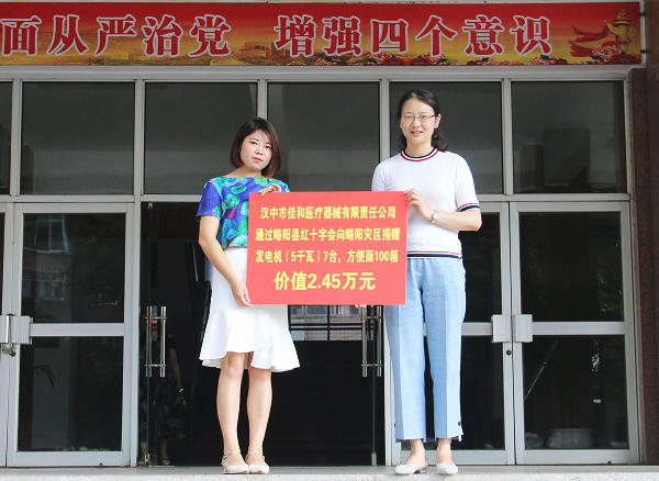 当前位置: 首页 > 新闻中心 > 综合要闻 > 正文 汉中市佳和医疗器械有限责任公司向我县捐赠2.45万元救灾物资 发表时间:2018-07-18 10:41 作者:罗洪谦 编辑:罗洪谦 资料来源:政府办 点击: 字体大小:[小 中 大] 分享: 7月17日,汉中市佳和医疗器械有限责任公司通过略阳县红十字会向我县捐赠了发电机(5千瓦)7台、方便面100箱等价值2.45万元的救灾物资,对受灾的群众表示慰问。县政府副县长丁侃代表县委、县政府接受了捐赠,并对爱心企业的善举表示感谢。
